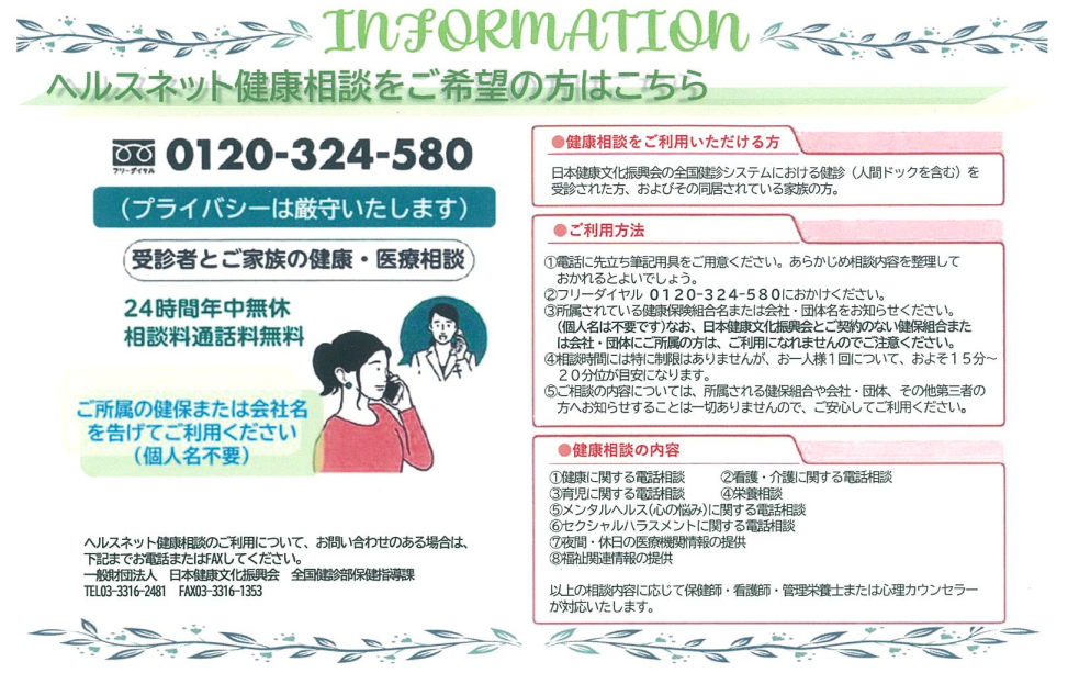 「けんしんナビ」で健診を申込まれた方は24時間年中無休で健康相談が受けられる「ヘルスネット健康相談」をご利用いただけます。
