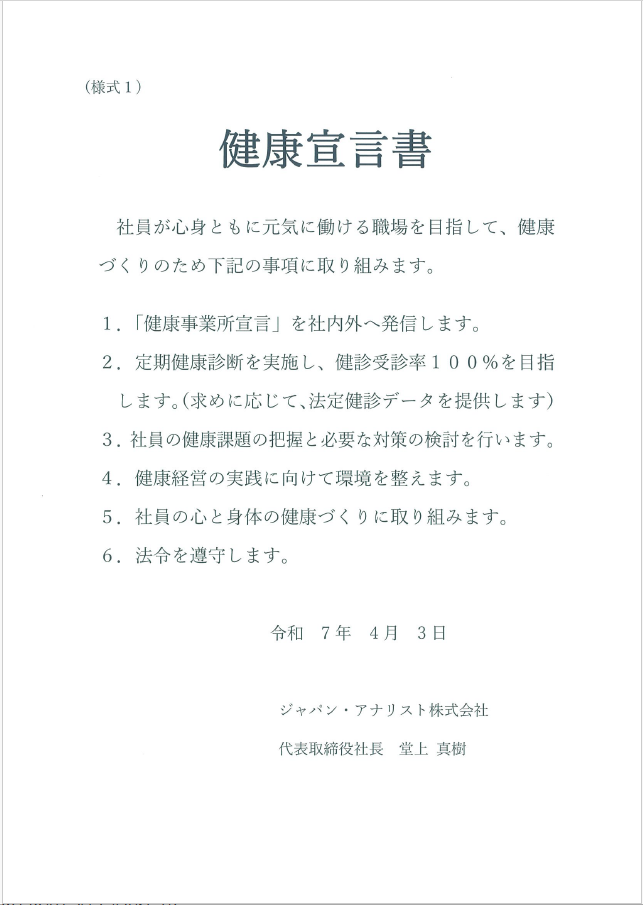 ジャパン・アナリストが「健康推進事業所」の認定を受けました