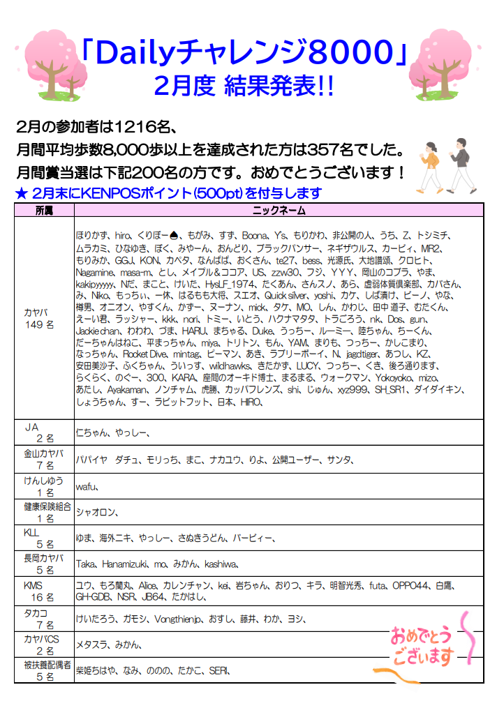 ★★結果発表★★ 「Dailyチャレンジ8000」2月度